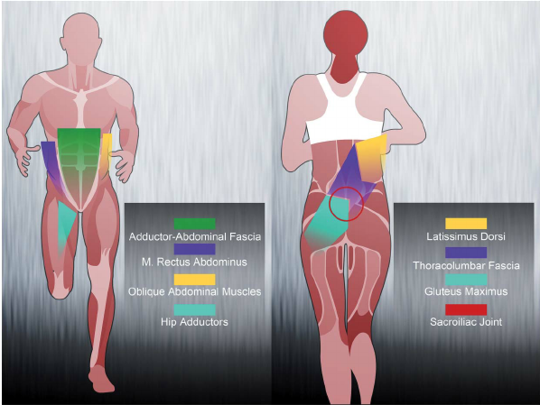 Przykład ujęcia Anterior Oblique Sling z zaznaczeniem external oblique, internal oblique i przywodzicieli jako jednej sieci mięśniowej. Ta taśma jest aktywna szczególnie w fazie kontaktu stopy z podłożem i w czasie przejścia przez fazy stance/swing, stabilizując tułów i przygotowując miednicę do kolejnego kroku.
