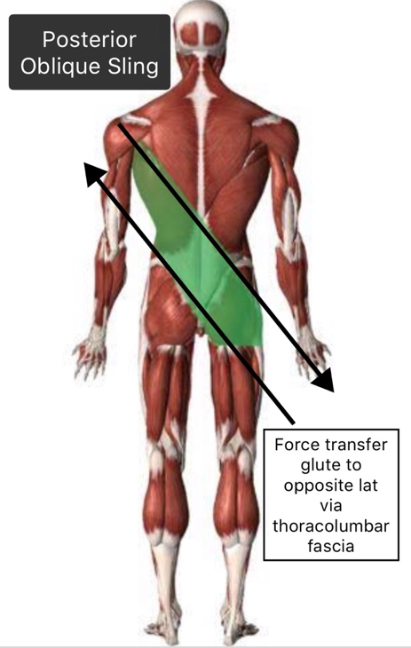 Łączy przeciwległe latissimus dorsi → thoracolumbar fascia → gluteus maximus, co: