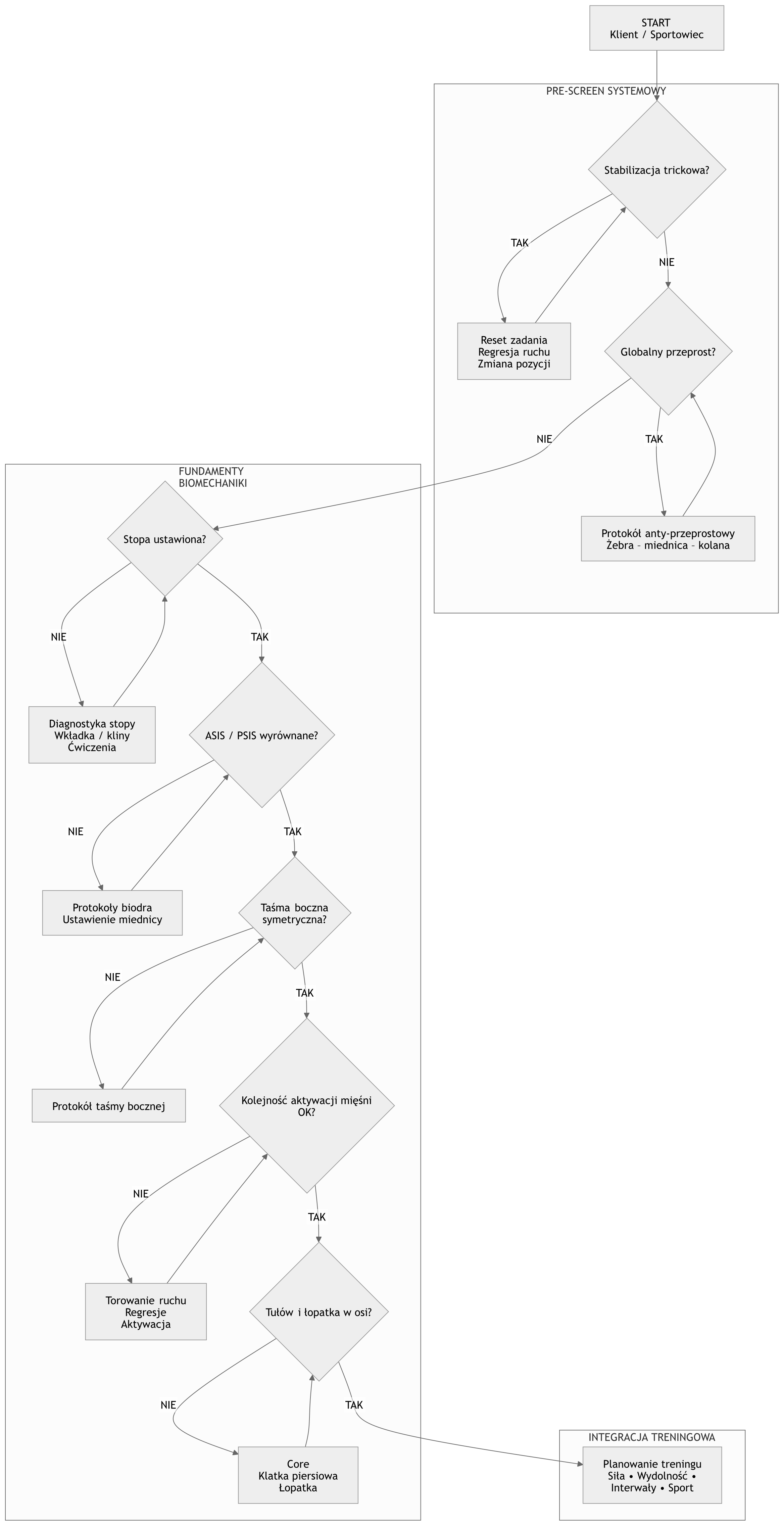 Drzewo decyzyjne jest sercem systemu. Trzy piętra, pre-screen, fundamenty biomechaniki, integracja treningowa. Retest po każdym protokole. Nigdy nie idź w dół, póki pytanie powyżej nie jest rozstrzygnięte na "tak". To drzewo nie zastępuje myślenia — porządkuje jego kolejność.