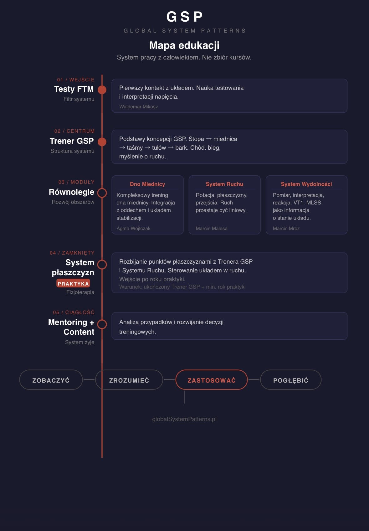 Etap czwarty — pogłębić. Tu są dwa elementy. System płaszczyzn — który jest zamknięty, wchodzi się do niego dopiero po ukończeniu Trenera GSP i po minimum roku praktyki. To jest praca z fizjoterapią, rozbijanie punktów płaszczyznami, sterowanie układem w ruchu. Warunek roku praktyki nie jest kapryśny. Bez niego nie masz z czym wejść do tego modułu — bo nie masz jeszcze klientów, na których mógłbyś testować to, czego się uczysz.
